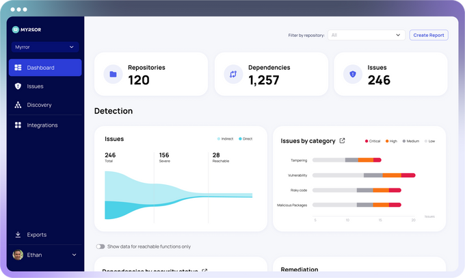 Myrror secures your software supply chain in real-time using multidimensional SCA engines, including vulnerability reachability analysis, which helps reduce false positives. Its Binary-to-Source tech uncovers threats traditional scanners miss and provides an optimized remediation plan to resolve vulnerabilities quickly.